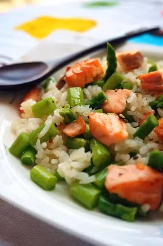三文魚;胡椒粉;米飯;蘆筍;鹽