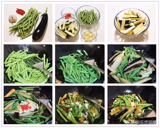第七步:在鍋中間留一塊空間出來,放入蒜片和小紅辣椒煸炒出香味。然後與茄子和豆角一起翻炒勻均。