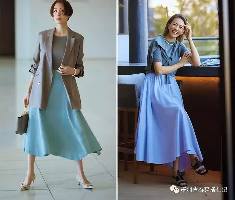 深灰色修身打底,搭配棕色長款西裝外套和淺藍色荷葉邊傘裙。恰到好處的淺藍色能夠呈現出知性而富有魅力的一面,右邊選擇了通勤針織搭配同色系的外搭和緞面半裙,沉靜自然。