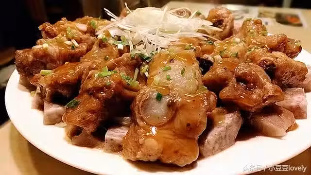 倒出盤中蒸出的汁水,加少許生粉水勾芡,然後均勻淋在排骨表面,撒上蔥花出鍋。