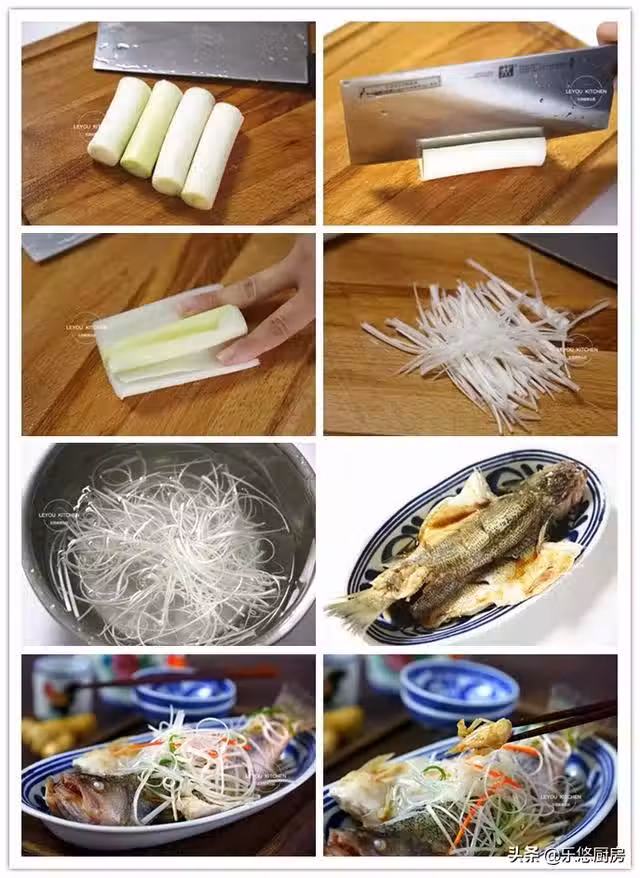 第十三步:切好的蔥絲,放到涼水中浸泡幾分鐘,蔥絲的形態會更好。也可以再切一些胡蘿蔔絲,用來點綴。