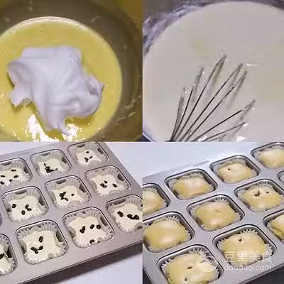 8、挖二分之一的蛋白霜到蛋黃糊內,用刮刀翻拌(像炒菜那樣的手法)均勻。 將混合了蛋白霜的麵糊倒進蛋白霜盆內,用刮刀繼續翻拌均勻。 同時烤箱150度上下火預熱。 混合好的麵糊裝進模具內,輕輕震動模具,撒上蜜紅豆。 送入烤箱中層,150度,上下火,烤25分鐘。(具體時間要根據各自的烤箱脾氣來定。)