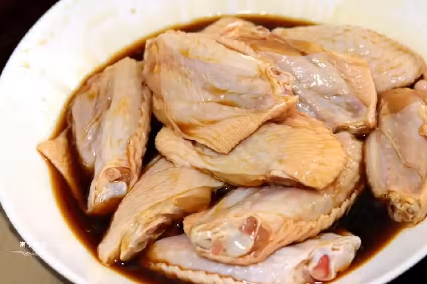 1、把雞中翅兩面都切花刀,然後放在碗里,放入一勺食鹽、1勺料酒、2片生薑、2勺生抽攪拌均勻腌制30分鐘