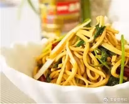 2、鍋燒開水,放豆腐皮絲焯水10秒撈出,瀝干水。