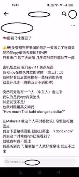 林小姐將自己在泰國險被迷魂黨詐騙的經過,在社交媒體上發帖控訴,望民眾多加小心。