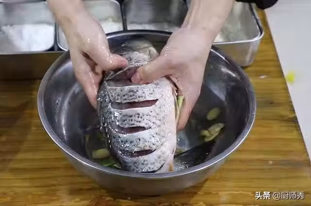 3、20分鐘之後,把魚身的蔥姜去掉,然後用玉米粉粘勻魚身,要讓魚的刀口都粘勻粉芡,油炸時候再抖掉多餘的粉芡。