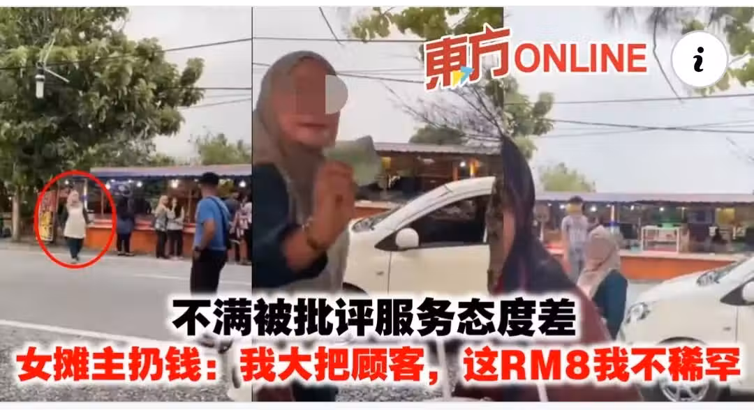 (吉隆坡15日訊)一名女攤主因不滿被顧客批評其服務態度差,將收取到的8令吉扔回給顧客,並直嗆顧客「我不稀罕這8令吉,因我還有大把顧客。」