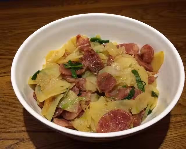 廣式臘腸蒸熟切片。油鍋入土豆片炒熟,加鹽雞精。
