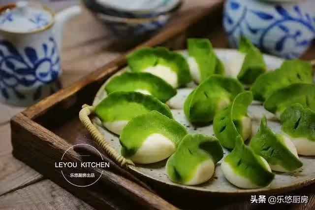 第三步:開始和餃子麵糰,需要兩塊等大的麵糰。一塊是普通的,一塊用菠菜汁和成的綠色麵糰,如圖。麵糰和好後,用保鮮膜蓋好醒30分鐘。(在和面的時候,建議先和普通麵糰再和綠色麵糰,這樣不會影響普通麵糰的顏色,不然得把手洗乾淨才可以。)
