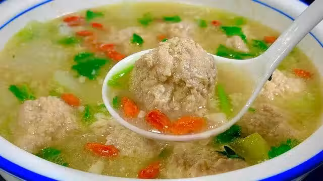 2、把蔥姜炒香後,再把冬瓜加進來炒熟,倒入清水燒開,把肉丸子放到冬瓜裡面,煮熟以後再加入生抽、白糖、雞精和食用鹽,再撒上一點枸杞,香菜葉,冬瓜肉丸子湯就做好了。