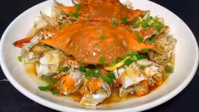 2、梭子蟹已經蒸好了,然後燒上熱油,把蔥花放到熱油裡面,激發出香味,再均勻的淋到梭子餡上面,淋上一點蒸魚豉油即可。