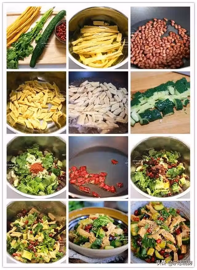 第七步:取一個大盆,依次放入切好的黃瓜,瀝干水分的腐竹,炸好的花生米,香菜段,蒜末,再放上一勺辣椒粉,如圖。