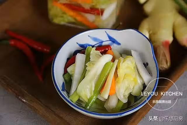 第一步:準備食材。圓白菜適量、芹菜幾根、胡蘿蔔半個、白蘿蔔適量、嫩薑1塊、小紅辣椒幾個。(還可以選擇黃瓜、白菜幫子等這些質地比較硬的蔬菜。辣椒的量隨自己的口味來放。)