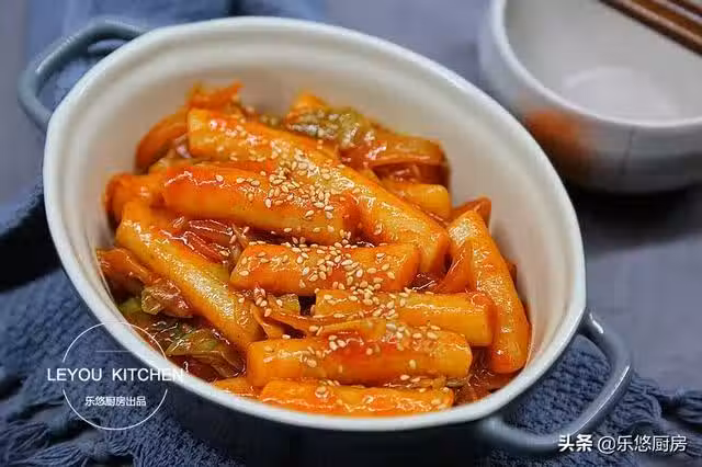 第一步:準備食材。條狀年糕400克、圓白菜少許、洋蔥少許,熟白芝麻適量。