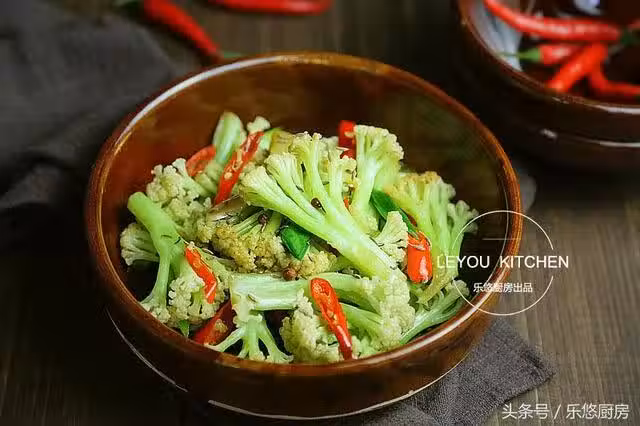 第二步:把菜花掰開,然後放入淡鹽水中浸泡一會兒。(浸泡後的菜花吃著口感更清脆。)