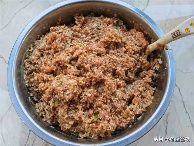 7.把切好的香菇放到調好的肉餡內,攪勻即可,香菇豬肉餃子餡就調好了,就可以包餃子了。
