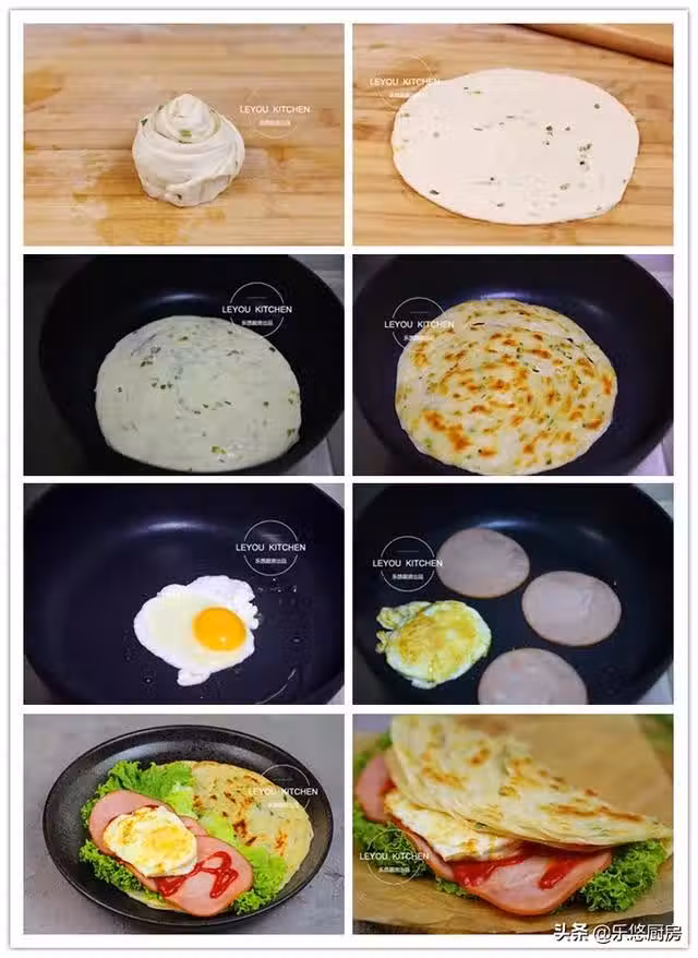 第十五步:往餅的一側依次放上一些蔬菜、幾片火腿、一個雞蛋、然後再擠上自己喜歡的醬料,如圖。