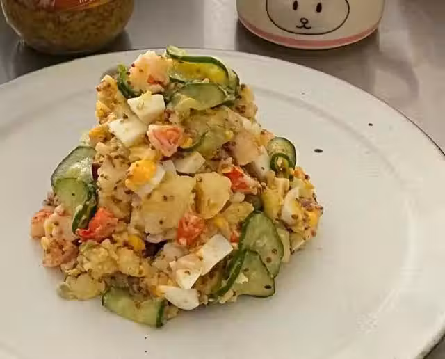 土豆剝皮搗成泥,加入醬料,加入黃瓜片洋蔥絲,雞蛋碎,蝦仁。攪拌均勻即可!