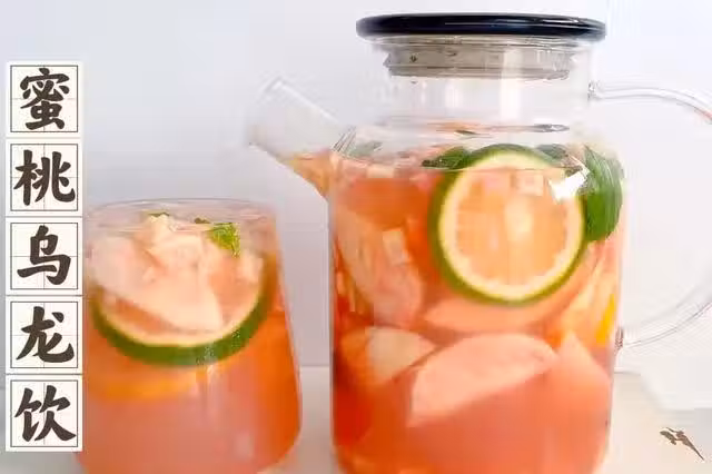 3.沖泡好烏龍茶晾涼,桃子切塊放入壺裡,加入蜜桃檸檬蜜十冰塊,倒入烏龍茶,放入薄荷攪拌一下即句。