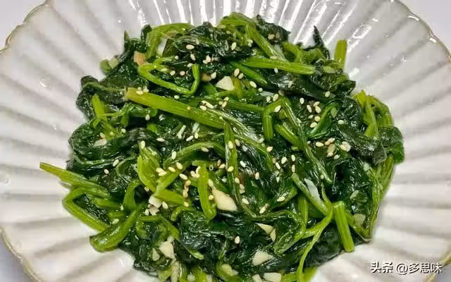 5、焯水的步驟很重要,這一步是為了去除菠菜中的草酸。焯水過的菠菜也會更加翠綠,這道菜蒜末也是精華,可以適當多放一些蒜,提增香味。