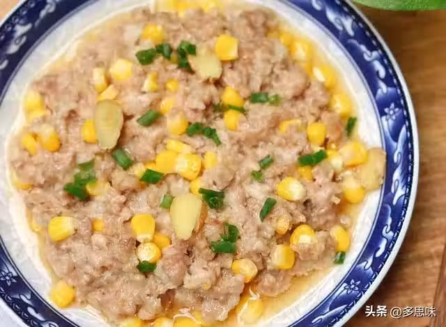 食材:三肥七瘦豬肉,玉米粒,蔥花,薑片、鹽,糖,胡椒粉,生抽,蚝油,麻油,料酒,澱粉