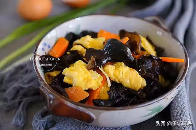 第二步 :把泡發好的木耳撕成小塊,胡蘿蔔切片,雞蛋打散,蔥姜蒜切末備用。