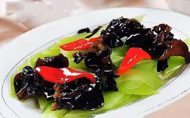 第五步,鍋中倒油,小火把大紅椒炒熟,然後再放入萵筍和黑木耳,放鹽,雞精,味精。然後中火翻炒,準備點生粉勾一個薄薄得芡水。慢慢的淋入鍋中,然後出鍋前淋點色拉油。