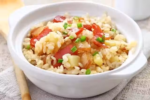大米淘洗乾淨後加入炒好的土豆塊和臘肉丁,加入沒過一指節的水,放入電飯 煲中煮熟後燜3 分鐘即可。