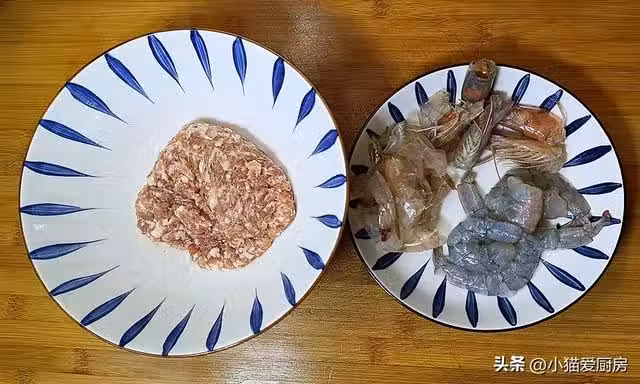 【步驟二】:把處理乾淨的蝦肉拍碎剁成餡,放入肉餡中,同時放入蔥姜水3-4勺、鹽1勺、胡椒粉1勺、料酒1勺、澱粉2勺、雞蛋清1個。
