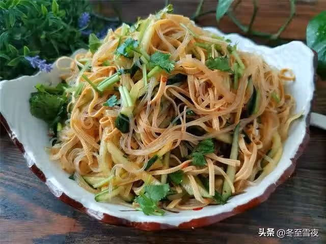 8.用筷子從下往上快速翻拌均勻,盛出裝盤即可。一盤清爽開胃的黃瓜干豆腐拌粉絲就做好了。