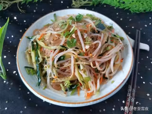 【綠豆芽黃瓜拌粉絲】所需材料:黃瓜1根、綠豆芽250克、粉絲1把、胡蘿蔔半根、香菜2棵、大蒜2瓣、鹽適量、辣椒油1湯匙、香油1湯匙、白糖1湯匙、米醋2湯匙、生抽2湯匙、