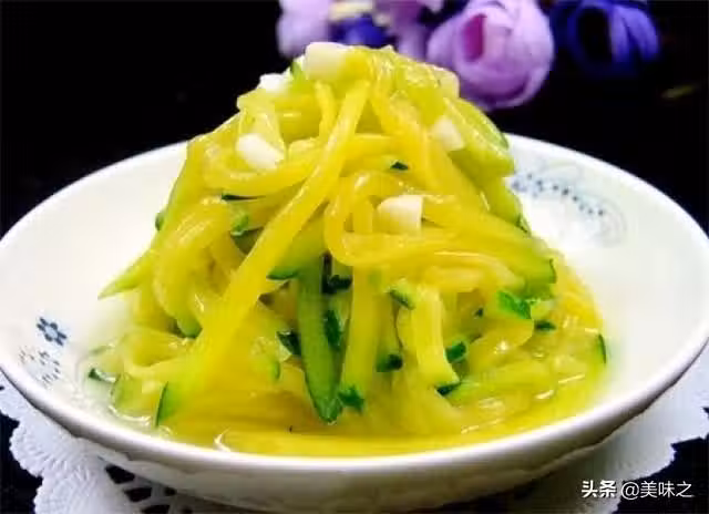 4、轉大火,入嫩南瓜絲翻炒至出水,調入鹽和雞精起鍋。