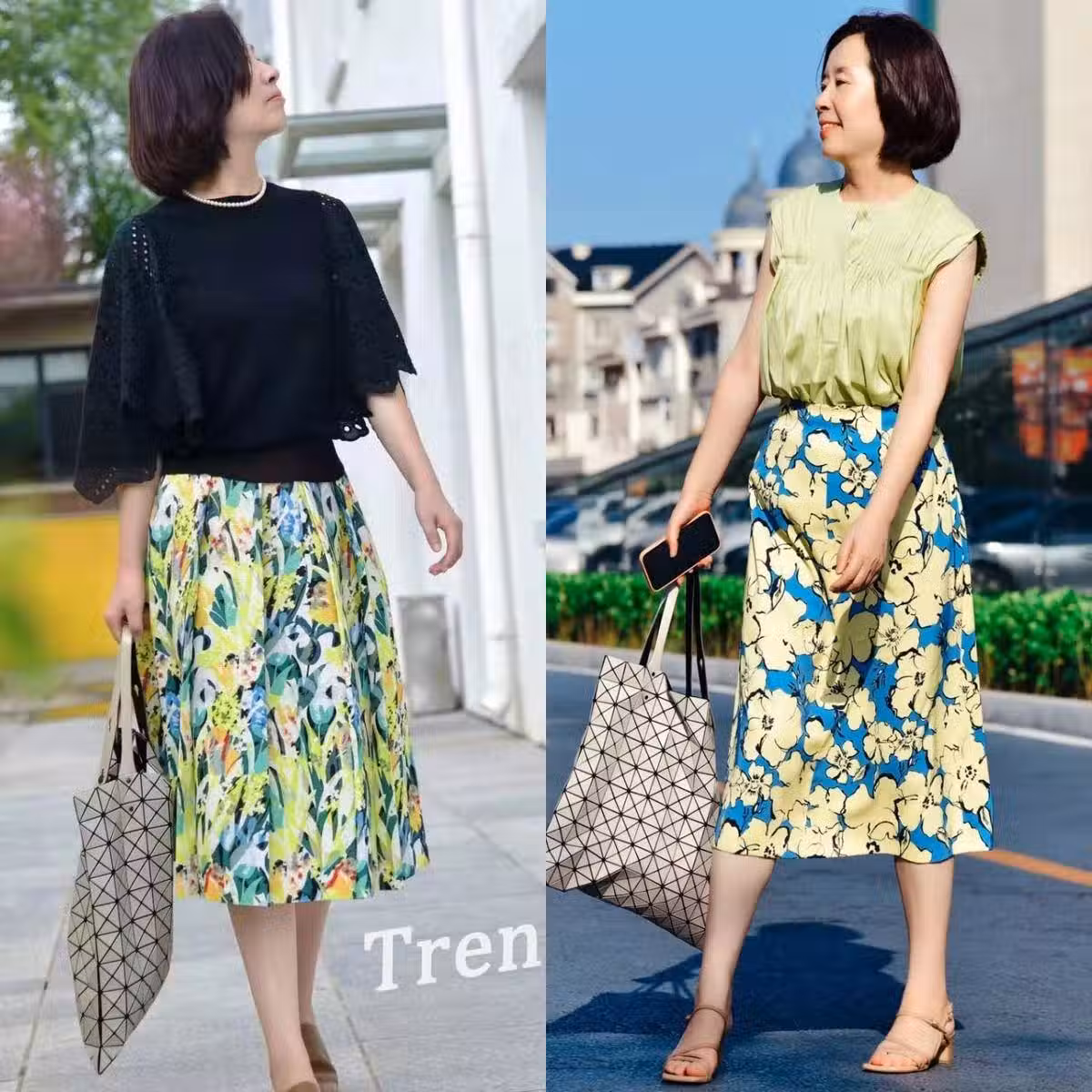 印花元素的半身裙也是春夏季節必備的單品之一,時髦又精緻,輕松打造出滿滿的氛圍感。但是在搭配這類花色較為復雜的單品時,一定要牢記「繁簡結合」的原則,盡量選擇純色的上衣進行呼應,這樣可以更好的突出搭配重點,整套look精緻有層次。