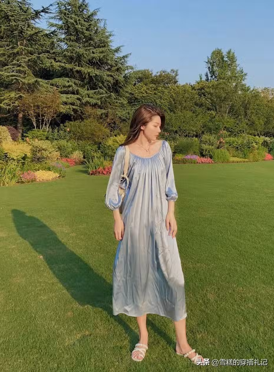 當然了,並不是所有人臀腿比例都非常完美,針對大多數的普通女性來講,五五分和下半身臃腫,都是很常見的身材問題。所以說,我們就不要刻意的選擇收腰裙了,無腰線的絲綢裙,不僅非常有質感,而且還能隱藏住身材短板。