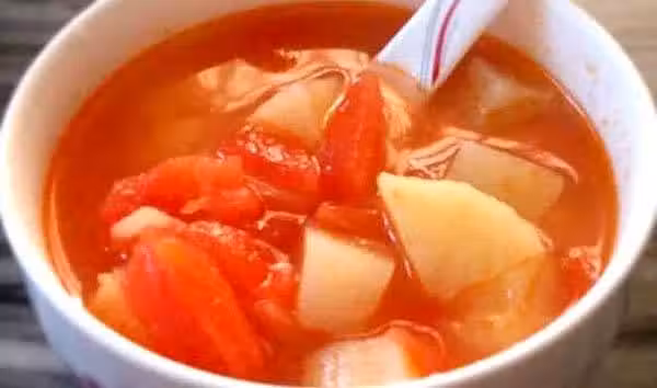 1、蕃茄先用開水燙一下,剝去外皮,在碗裡削成小塊。馬鈴薯和胡蘿蔔切成丁。
