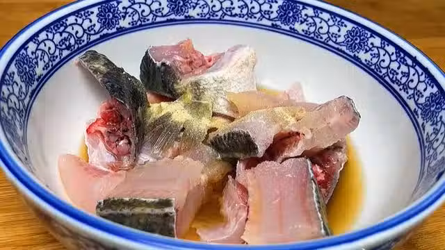 4.把魚肉魚皮朝下平鋪在案板上,然後片成3毫米左右的片,魚片儘量片長一點,這樣就能把魚刺片斷,這樣給小朋友吃也會非常的放心。全部片好後放進大碗中,加入清水清洗乾淨,然後把水擠干放進大盆中,加入適量鹽、白鬍椒粉、少許黃酒,抓拌均勻,抓至有一點點粘手的狀態就可以了。放在一邊腌制20分鐘。