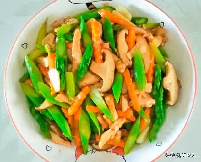 3、平底鍋加熱加點油炒香蔥姜蒜,然後加香菇胡蘿蔔翻炒,加1勺蚝油炒香,然後加肉絲炒散,加點鹽和五香粉,最後加蘆筍快炒出鍋。