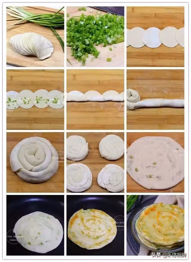 第十步:把平底鍋燒熱,抹少許油,然後把擀好的蔥花餅放入鍋中,小火開始烙制。