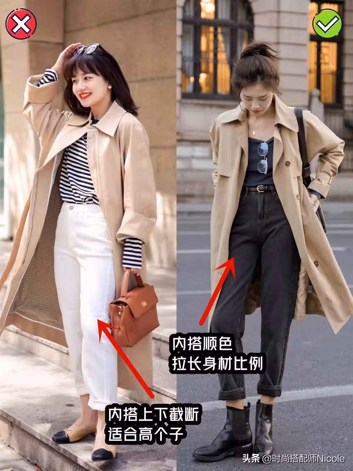 同理,在穿搭上多強調縱向線條的搭配,避免過多橫向線條的產生,能使身形看上去更更修長。