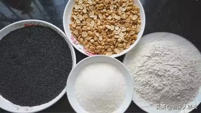 第二步:炒熟的花生放涼後,把它的外衣脫掉,然後把芝麻和花生打碎,可以用料理機也可以手工壓碎,自己怎麼方便怎麼來吧,加碎後放一起,再加入白糖,白糖就按自己的口味了,喜歡甜的就加多點,攪拌均勻備用