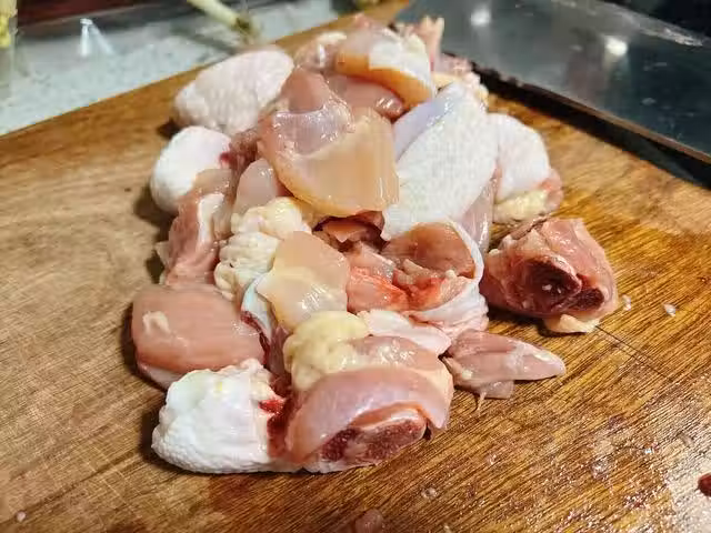 2️⃣ 用料酒、生薑片、胡椒粉和鹽把雞腿肉抓勻,然後加1勺澱粉,抓勻腌制15分鐘。