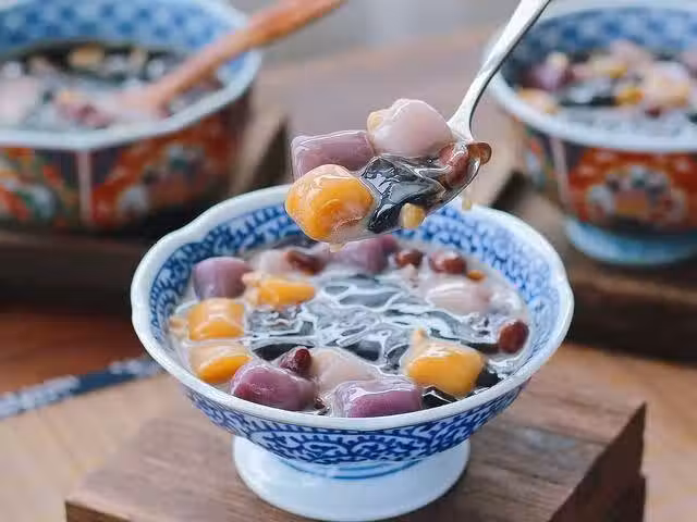 說它是冷飲,其實它不算冷,不用冷藏也不用冷凍,在室溫下製作、保存就可以。神奇的是吃到嘴裡卻有冰涼的口感,又嫩又滑。而且它不含任何添加劑,還有一定的滋補功效,這就是——紅豆芋圓燒仙草。