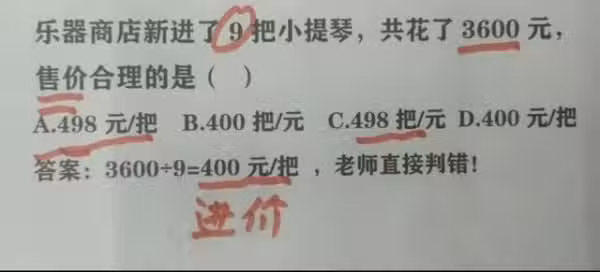 這道數學題目是:一商店進了9把小提琴,一共花費了3600元,合理的售價是多少呢?莉莉反覆看這道題很迷惑,懷疑老師是誤判了,準備到學校跟質問老師!