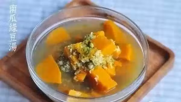原料:老南瓜一斤、綠豆二兩、鹽適量