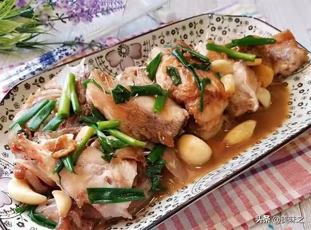 紅斑魚1條、蒜5-6瓣、姜1小塊、蔥2根、油2大匙、生抽1.5湯勺、糖2茶匙、料酒2大匙、水1湯勺。