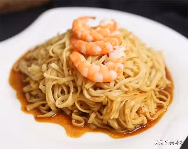 8、將蔥油醬倒入與麵條混合拌均勻,放入蝦仁即可。