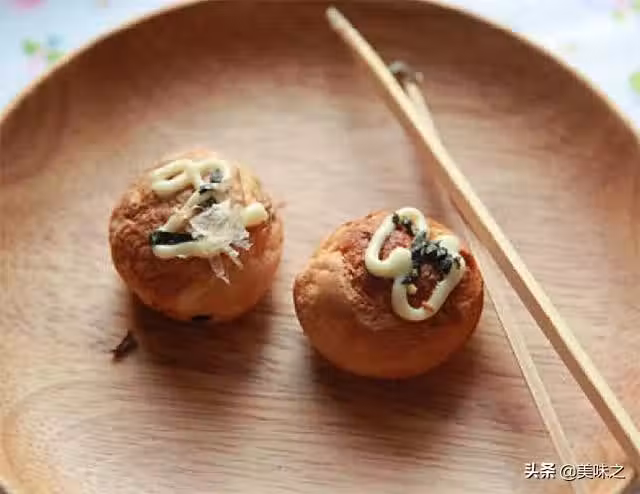 6、將丸子翻面,待全部上色後盛出,表面擠沙拉醬,撒海苔碎和木魚花即可食用。