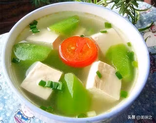 絲瓜1根、豆腐2塊、芝麻油適量、鹽適量、小蔥適量、雞湯適量、小西紅柿2個。