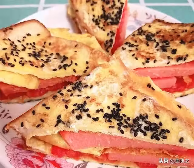 麵包片4片、雞蛋4個、火腿片4片、西紅柿1個、黑芝麻適量、鹽適量。
