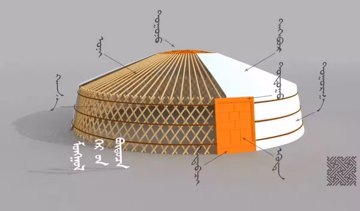 頂部中心一般有一個圓洞,稱作「額」。額頂四周的邊緣叫「烏蓋」,用來裝飾。頂蓋上還有一塊稱為「哈那」(哈那是一塊圓形的白布)的東西。